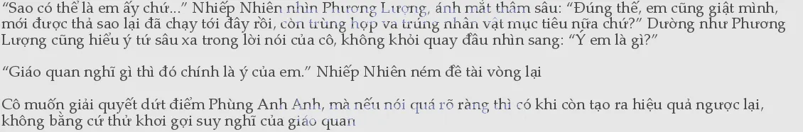 Nhiếp Nhiên thu hồi suy nghĩ của mình, nhún vai nói: “Em cảm thấy việc mà giáo quan nên làm ngay bây giờ là nghĩ xem làm sao để cứu Phùng Anh Anh ra chứ.”