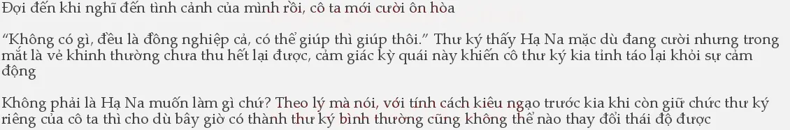 Từ sau khi cô ta bị giáng chức, đồng nghiệp xung quanh ngại uy nghiêm trước kia của cô ta, lại sợ Hạ Na không2làm tốt công việc của thư ký bình thường, làm hại mọi người đều bị trừ lương, cho nên gánh vác cho cô ta rất nhiều