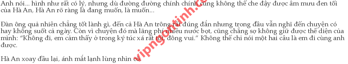 Hà An không nói gì, kéo lấy cô tiếp tục đi về phía trước. “Này, này, em đang nói chuyện với anh đấy! Này... này...”