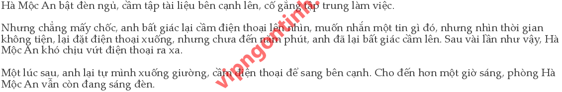 Trong phòng người giúp việc, nhìn qua lùm cây, nhà thiết kế riêng của ngài Hà, bà Cao, mặc một bộ đồ ngủ lụa, đứng cạnh cửa sổ băn khoăn: “Mấy ngày nay làm sao vậy? Sao ngài ấy còn chưa đi ngủ? Đã hơn một giờ rồi, bình thường ngài ngủ nghỉ rất có giờ giấc.” “Chắc là bận quá, tôi thấy mấy hôm trước, thư kí Thi đem rất nhiều tài liệu đến, có lẽ tập đoàn Hà Mộc có việc gì đó quan trọng cần ngài giải quyết. Bà ngủ trước đi, tôi đi rót cho ngài ấy cốc sữa, rồi cũng đi ngủ.”