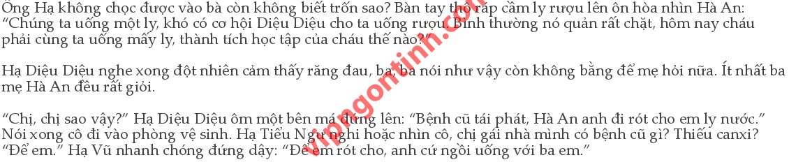 Hà An lại ngồi xuống. Vẻ mặt ông Hạ càng ôn hòa hơn, cảm thấy Hà An chịu không ít khổ từ chỗ bà nhà mình, muốn giúp Hà An thoải mái một chút: “Thành tích thế nào? Chắc cháu cũng là sinh viên ưu tú.”