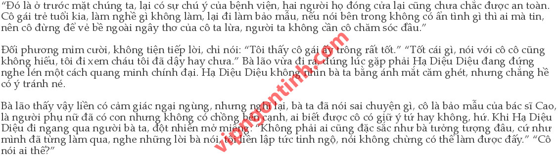 Một bà lão vừa đến chưa được hai ngày nghe thấy vội vàng bước ra giảng hòa: “Bỏ đi bỏ đi, tụi nhỏ vẫn còn ở đây, đừng làm mất hòa khí, mỗi bên nhường một câu đi nào.” Hạ Diệu Diệu không buồn cãi nhau với bà ta, cố đi vào nhà vệ sinh lấy nước, trở về giường chăm sóc cho Thượng Thượng. Bà lão ở bên cạnh vẫn còn cố ý tiếp tục bàn tán. Hạ Diệu Diệu không buồn bỏ vào tai, dù sao hôm nay cô cũng xuất viện rồi, bà ta thích nói với ai thì cứ nói.