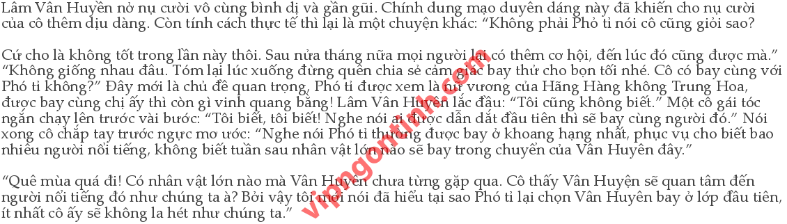Giang Hồng Triết bị đuổi đến bên cạnh cô, hai tay đút vào túi, thần thái tự nhiên, giọng cưng chiều: “Trưa nay muốn ăn gì? Chúc mừng em trước nha! Tuần sau em được bay thử rồi.” Lâm Vân Huyên liếc xéo anh ta một cái. Ánh mắt không có gì đặc biệt nhưng tuyệt đối cũng không kém phần thâm ý: “Sao anh biết tuần sau em bay thử? Hôm nay Phó tỉ mới quyết định mà.” Giang Hồng Triết nhìn cô ta với vẻ thần bí: “Anh có nội gián, không nói em biết.” Phong thái anh ta phong lưu phóng khoáng, mê hoặc lòng người. Lâm Vân Huyên hờn dỗi trừng mắt nhìn anh ta, hoa hồng dù có gai nhưng khi gặp đúng người thì cũng cúi đầu uy hàng: “Em tưởng anh không biết. Chiều nay anh có được nghỉ không?” “Chỉ cần em yêu cầu thì đó là vinh hạnh của anh!”