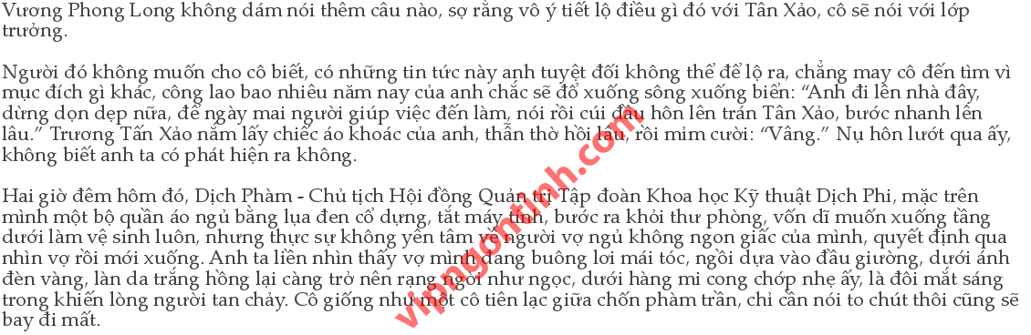 Khóe môi vốn dĩ đang nghiêm nghị của Dịch Phàm bỗng trở nên mềm mỏng hơn, anh ta vuốt nhẹ mái tóc mềm mại của cô, lên tiếng: “Muộn thế này rồi sao em còn chưa ngủ?” “Em đợi anh mà.” Vương Niệm Tư ngồi lại gần hơn một chút, hoàn toàn không giống với hình tượng đại tiểu thư cao sang bên ngoài. Dịch Phàm buồn rầu: “Ngủ muộn không tốt, lần sau anh sẽ chú ý hơn, cố gắng không đem việc về nhà làm ảnh hưởng đến em.” “Không trách anh, là ba cứ đem việc đến cho anh mà không báo9trước, anh đã bận việc ở công ty rồi, về nhà lại còn lo việc của ba, em đã cảm thấy rất có lỗi rồi.” Cô ấy dựa vào lòng chồng, cảm nhận mùi hương quen thuộc trên người anh, rồi bỗng nhiên lên tiếng: “Hôm nay em đã gặp một người, cô ấy đã từng yêu một người mà mình chẳng thể nào tưởng tượng ra được, có một cuộc tình cô ấy cũng chẳng thể nào nghĩ tới, rồi lại kết thúc không chút tăm hơi, anh nói xem liệu cô ấy có muốn biết mình đã từng yêu một người như thế nào không?” Đôi khi... cô cảm thấy Diệu Diệu nên biết? Cô có nên nói cho cô ấy biết không? Ít ra cũng không để bạn mình từ đầu6đến cuối hoàn toàn không biết