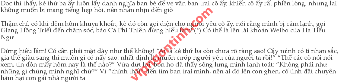 Nói thì khó nghe, đến anh trai người ta còn không buông tha! Chẳng qua điều kiện không được bằng nhà cô ta, bắt nạt người thấp cổ bé họng, dùng thủ đoạn đó đối phó với người ta! Con người đó xấu xa đến thế là cùng! “Không chỉ xấu xa, mà còn đểu cáng! Cái gì mà bám lấy Giang Hồng Triết không tha!” “Nhìn mấy tấm ảnh đó, rõ ràng thấy Giang Hồng Triết bám lấy Cá Phi Thiên mới đúng!” “Cá Phi Thiên xinh đẹp như vậy, thiếu gì người theo đuổi, họ đã yêu nhau từ hồi trung học rồi, làm gì đến lượt cô bạn gái nào đó mới về nước vài năm nay.” “Nếu trong bọn họ thực sự có một2người là kẻ thứ ba, thì nhất định không phải là Cá Phi Thiên!” “Mau gửi vài bức ảnh sang đây, rồi đem điện thoại đến nơi chuyên giữ đồ đánh rơi trả về cho chủ.” Cô ta muốn xem xem lần này Lâm Vân Huyên sẽ còn gì để nói! “Cậu nhìn những bức ảnh này chưa? Ai là “chính thất” thì nhìn là biết, không biết ai mà thất đức thế, lại có thể hình dung như vậy về Cả Phi Thiên, gia cảnh nhà người ta không được tốt lắm, nhưng cũng chẳng đắc tội gì với cô ta, bình thường trên Weibo cũng chỉ toàn ảnh chó mèo, ăn mặc giản dị, có thể thấy là một người rất đơn giản.” “Có lẽ lần trước9đến đây tìm người yêu cũng là đã lâu không gặp, trang điểm xinh đẹp một chút, con gái thích phù phiếm cũng dễ hiểu, nhưng cũng đâu đến nỗi khó nghe như lời đồn.”