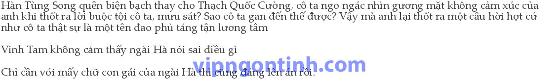 “Hạ Diệu Diệu là bạn gái cũ của tôi.” Hàn Tùng Song lập tức suy sụp! Bạn gái cũ anh! Hạ Diệu Diệu, con tiện nhân đó lại là bạn gái cũ của Hà Mộc An, cô giẫm phải cái vận may chó gì thế này!5Không thể nào! Không thể nào! Tiền đồ của cô ta, tương lai rực rỡ của cô ta, sao tất cả lại biến mất thể này, con tiện nhân đó sao có thể là bạn gái cũ ngài Hà, sao có thể...