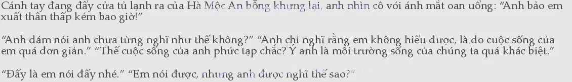 Hạ Diệu Diệu lập tức phẫn nộ chặn lại: “Này, vội vàng thèm thuồng ai đó thể rồi à?” “...” Hà Mộc An im lặng rút tay về, đóng cửa tủ lạnh lại, nếu không phải hai người họ đã từng chung sống với nhau, với những lời nói chặn họng thế này, lại còn nói nhiều như vậy, chắc chắn anh sẽ cảm thấy ai đó đang có thù với mình, bảo anh tuỳ tiện lấy một cô ả ngoa ngoắt về”