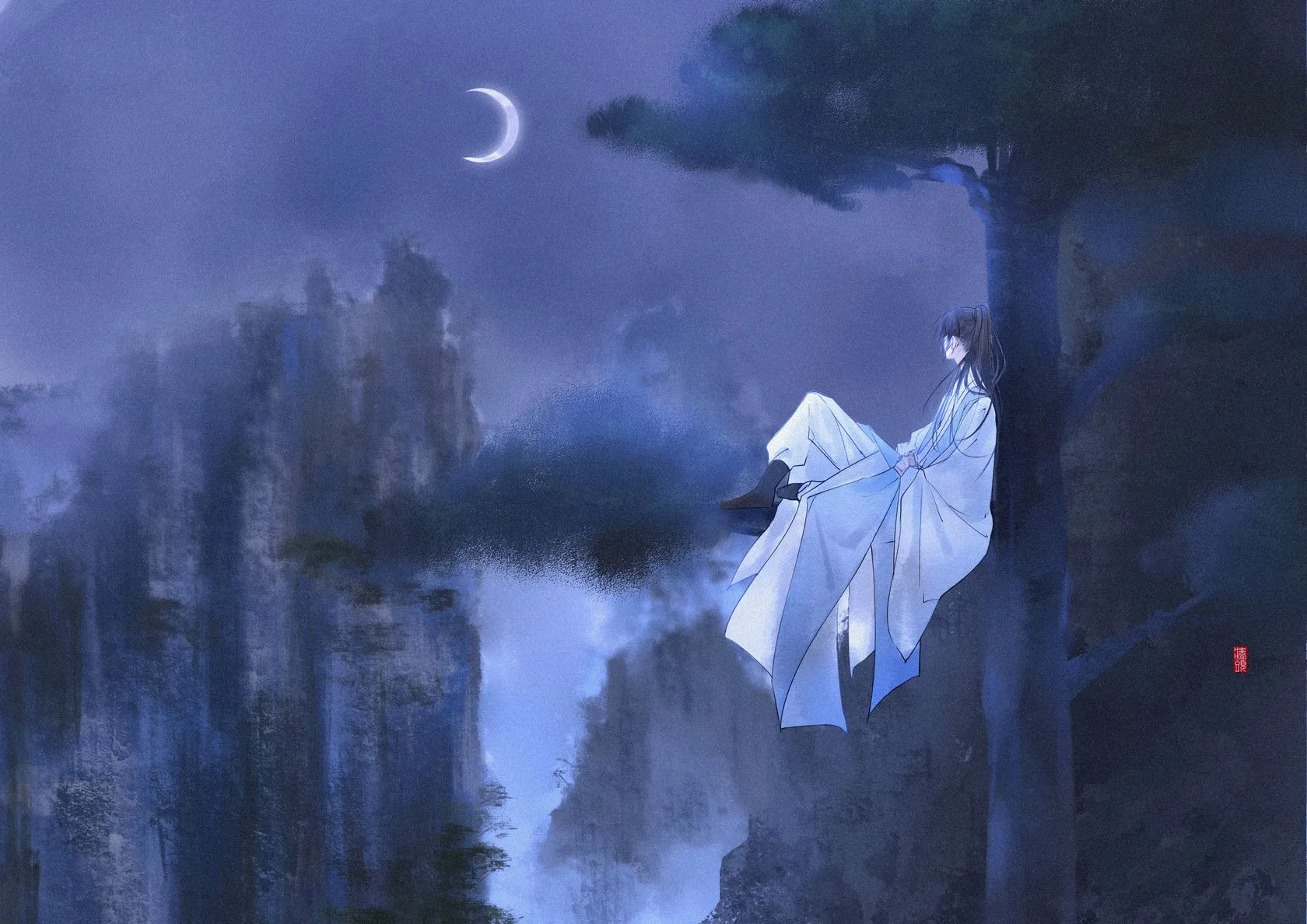 Mái tóc dài của người nọ được buộc gọn gàng, một chân gập cong, đai thắt eo màu lam gần như không có vết nhăn, vạt áo trắng dài rủ xuống khỏi cành cây. Sợi dây rối màu trắng vẫn quấn quanh những ngón tay, hắn dõi nhìn vầng trăng khuyết không nói lời nào, chẳng biết đã nhìn như vậy bao lâu rồi.