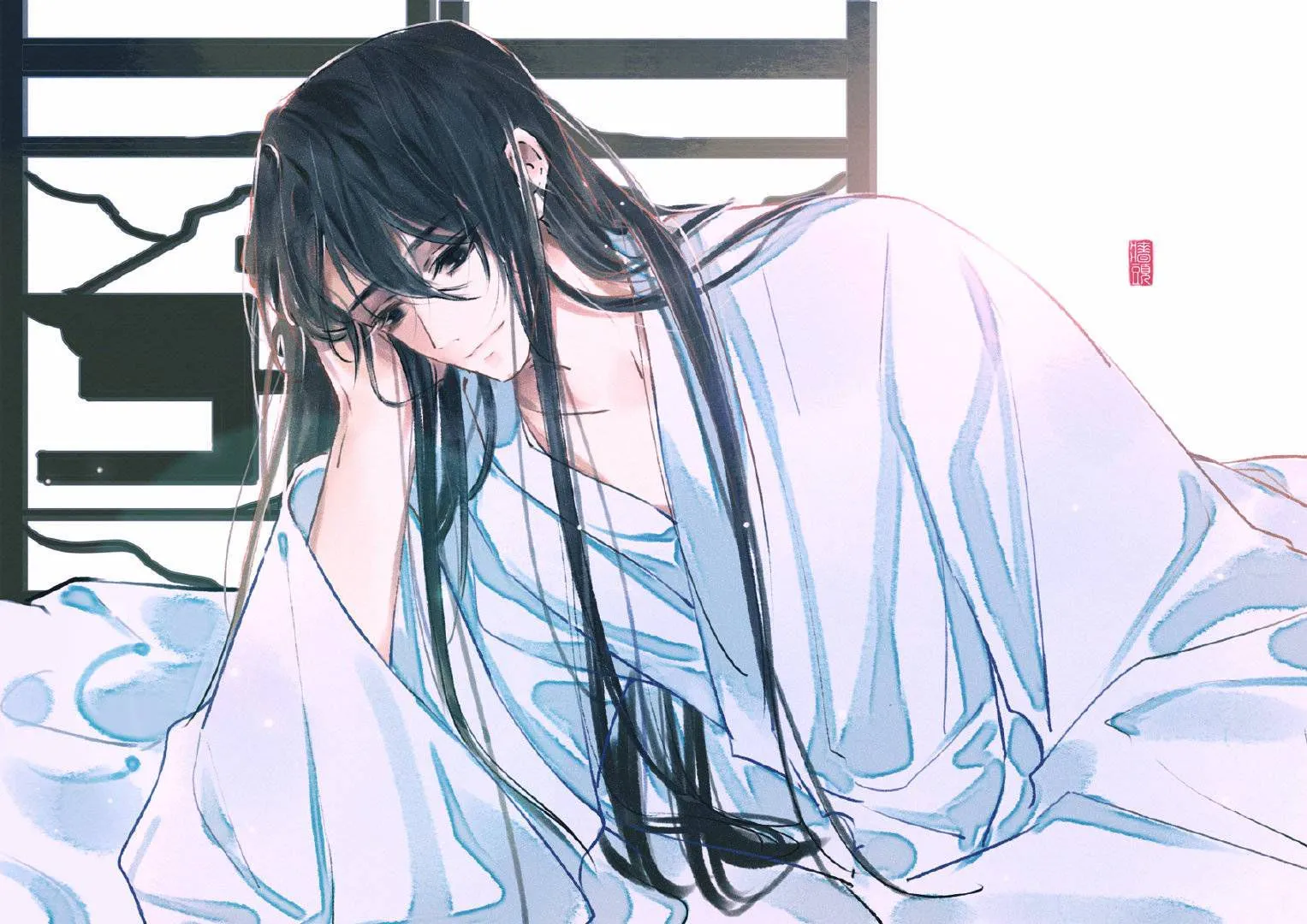 Trong căn phòng, Trần Bất Đáo đang chống cằm đọc một cuốn sách cổ, Văn Thời gối lên chân anh cuộn người ngủ say sưa.