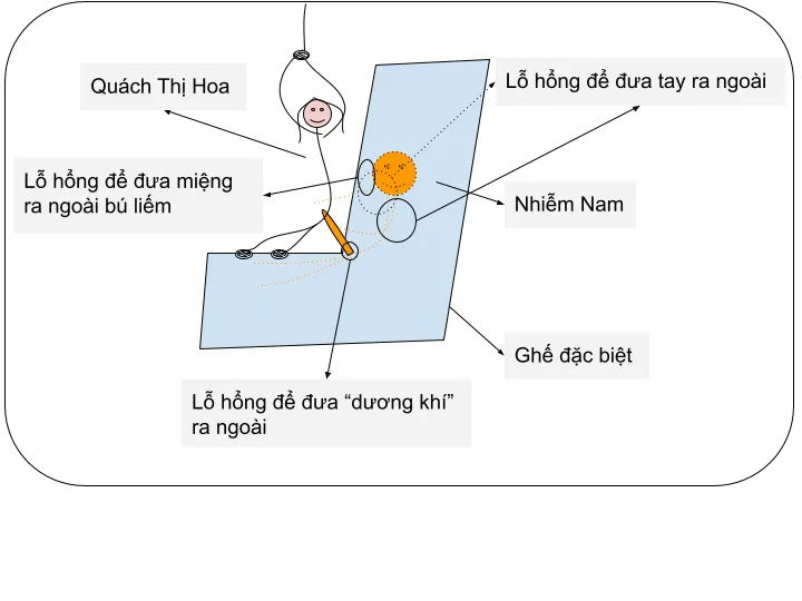 Chiếc ghế thay chỗ cho chiếc bàn. Quách Thị Hoa bị treo tòn ten trên không trung. Hai con quái vật người cây theo lệnh điều chỉnh cho tiểu Nhiễm Nam nằm ngay giữa ngã ba xinh xinh của Quách Tiểu Thư rồi nắm lấy hai bàn chân xinh đẹp của cô nàng, trói bằng còng và dây xích điện từ vào hai bên ghế.