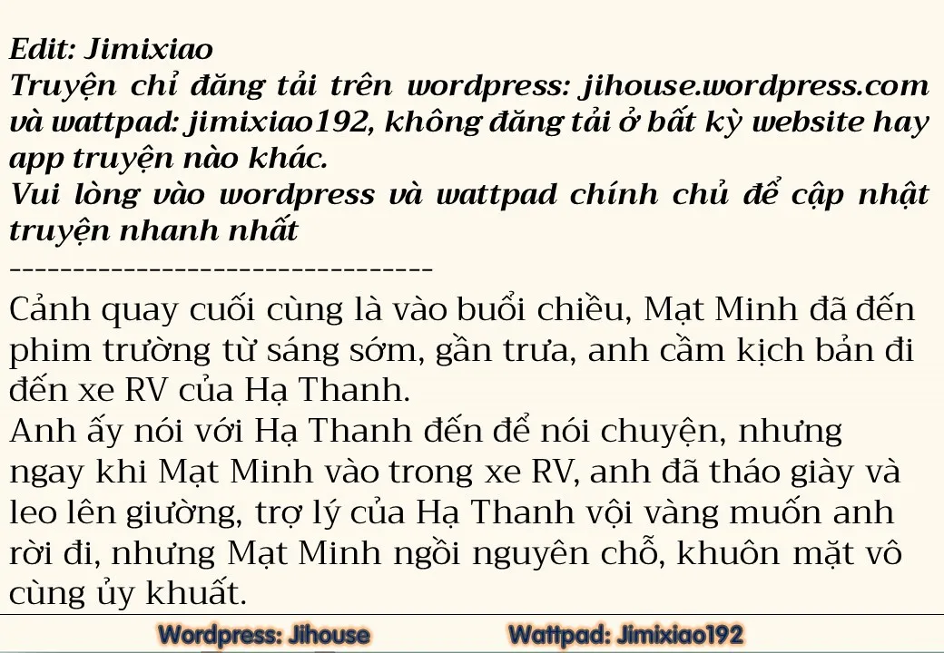 “Có anh Hạ ở bên em, em sẽ không đóng phim nữa. Ngày mai em sẽ tuyên bố rút lui, cũng tuyên bố chia tay với Hàn Thiệu Chu”. Mạt Minh ngoan ngoãn nói,” Từ nay em sẽ ở bên anh Hạ, anh Hạ bảo em làm cái gì em sẽ làm cái đó”.